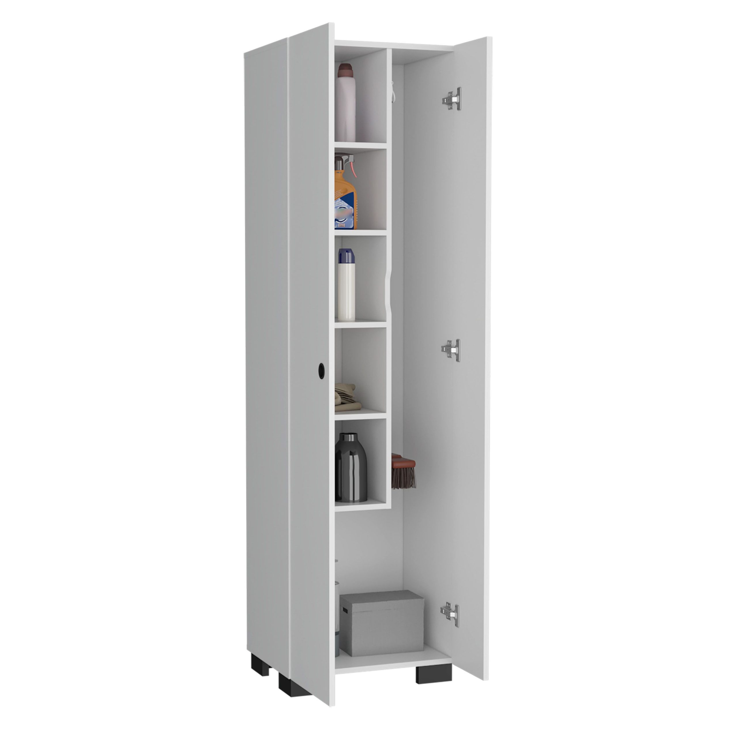 Lake Broom Cabinet Slim-Design Storage Solution with Inner Shelves and Side Broom Hangers White